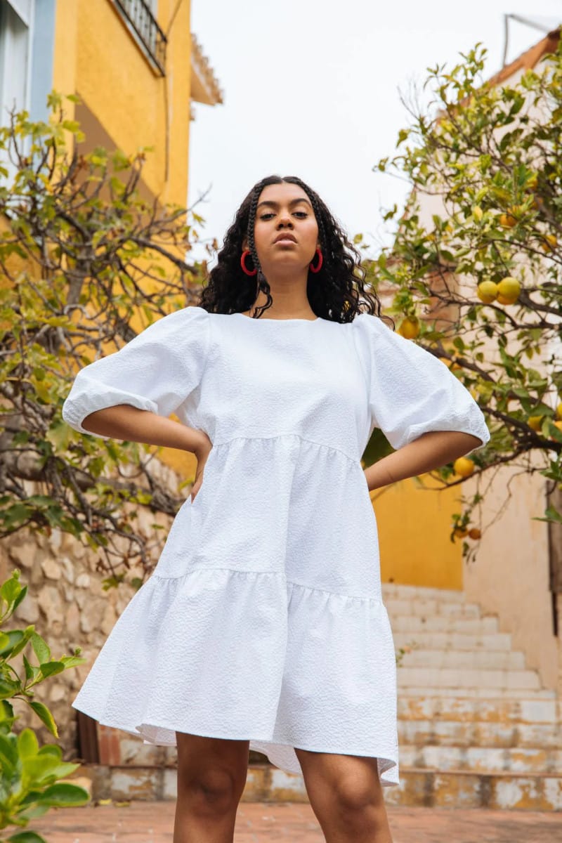 Valkoinen Tiered Mini Dress on valmistettu laadukkaasta luomupuuvillaisesta seersucker-kreppikankaasta. Väljässä mekossa on puolipitkät puhvihihat ja runsas kerrostettu minimittainen helma. Niskassa nauhakiinnitys ja keskitakasaumassa syvä halkio, joka ulottuu vyötärösaumaan. Mekon väri on puhdas valkoinen ja materiaali jämäkkää puuvillakangasta. Vuorittamaton. Tiered Mini Dress on helppo stailata omaan tyyliin, ja se taipuu tilaisuudesta toiseen asusteita vaihtamalla. Korkojen ja pikkulaukun kanssa juhlaan, ja tennareiden tai sandaalien kanssa arkeen.