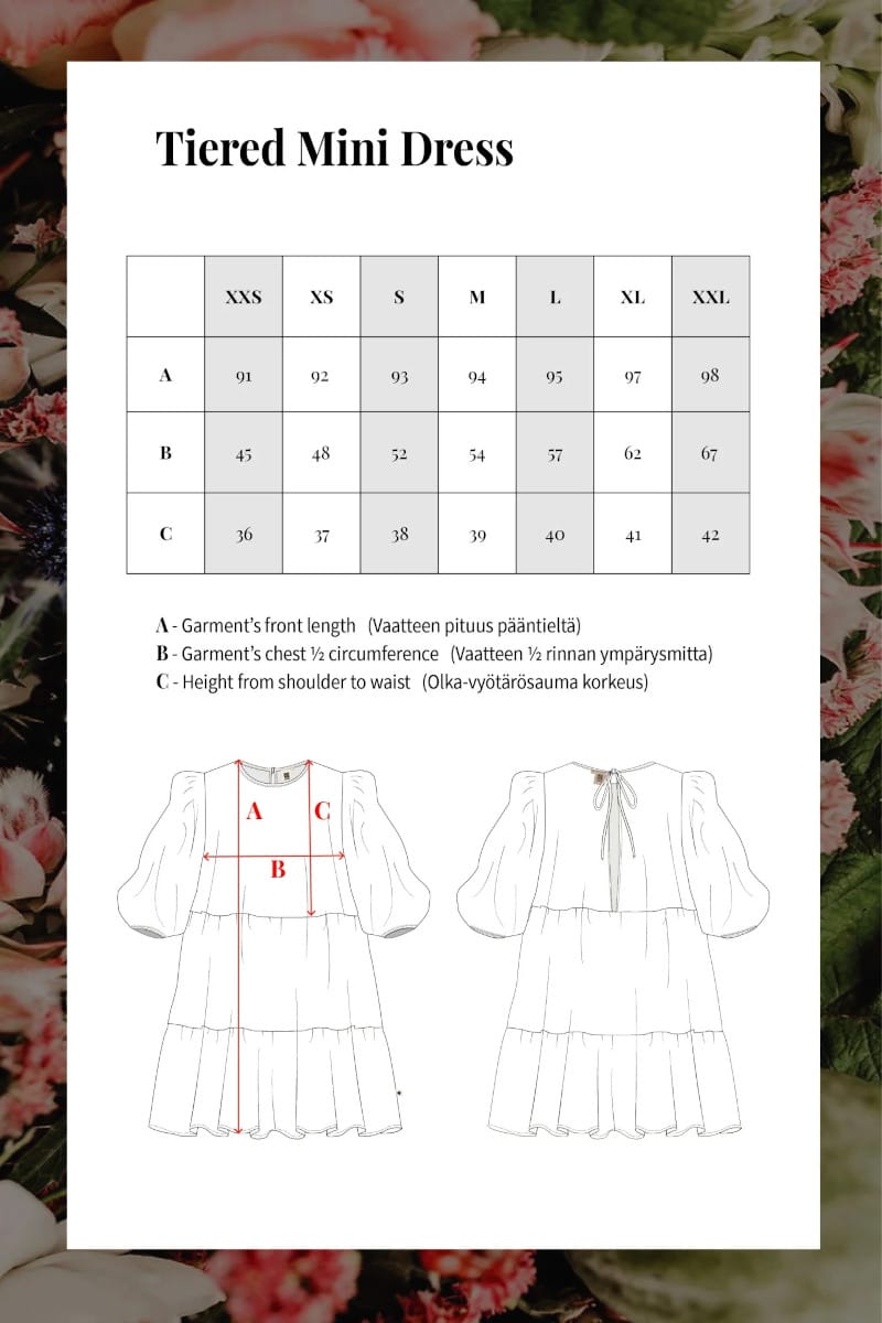 KOON VALINTA Tiered Mini Dress on mitoitukseltaan väljä. Käytä koon valinnan apuna vartalonmittataulukkoa ja tuotteen mittoja (viimeinen kuva). Mallit ovat 165 cm ja 175 X pitkiä ja heillä molemmilla on yllään koko M.