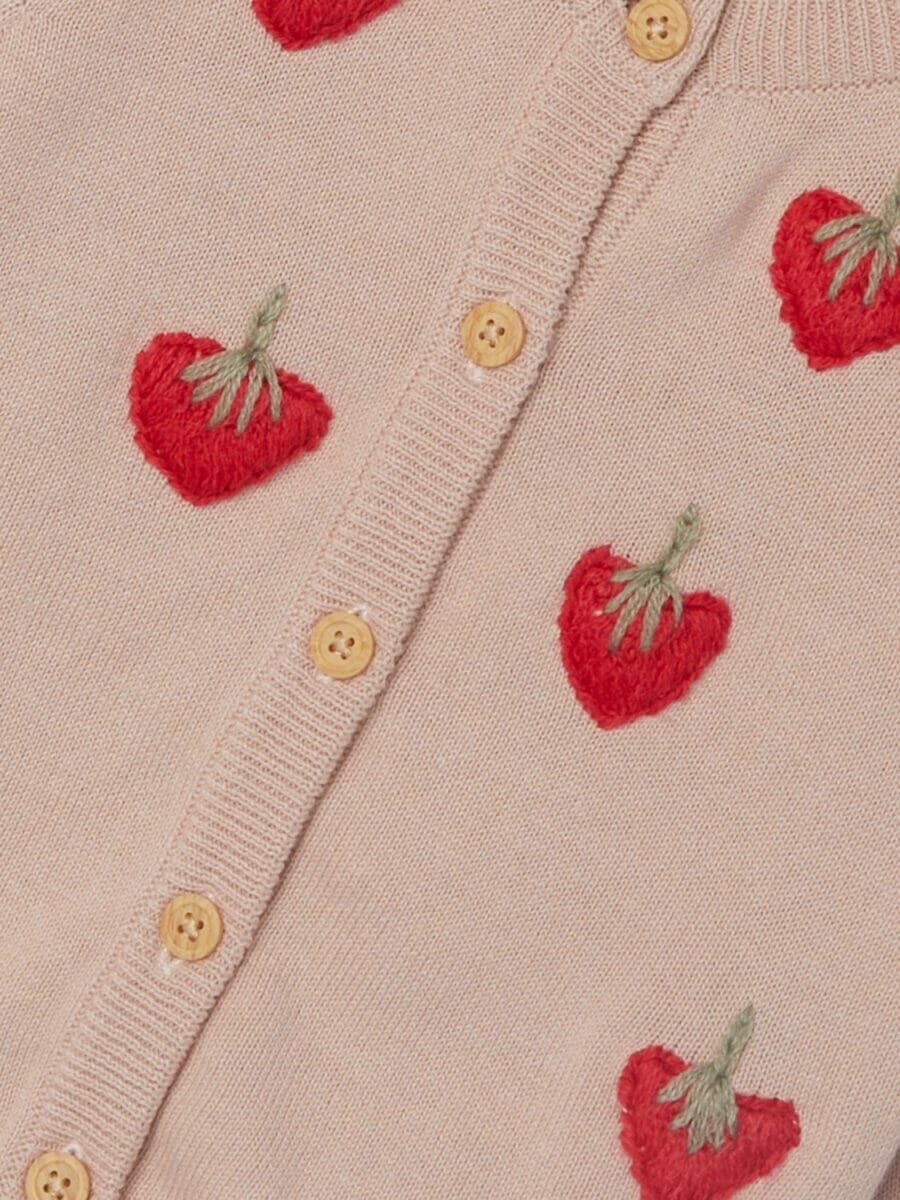 Name it NBFJUNA on vauvan luomupuuvillainen neuletakki, jossa kaunis mansikkakuosi. Neuleessa on nappikiinnitys.